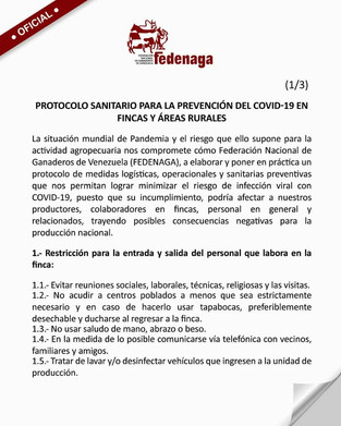 Fedenaga a través de su cuenta en la red social twitter publico el protocolo que debe ponerse en práctica en la zona rural y en las fincas. A juicio de Armando Chacín presidente del ente gremial en vista de lo preocupante de la pandemia, el protocolo sanitario esta realizado y adaptado a la cotidianidad, es práctico, y fue elaborado por profesionales en epidemiología que son Veterinarios.